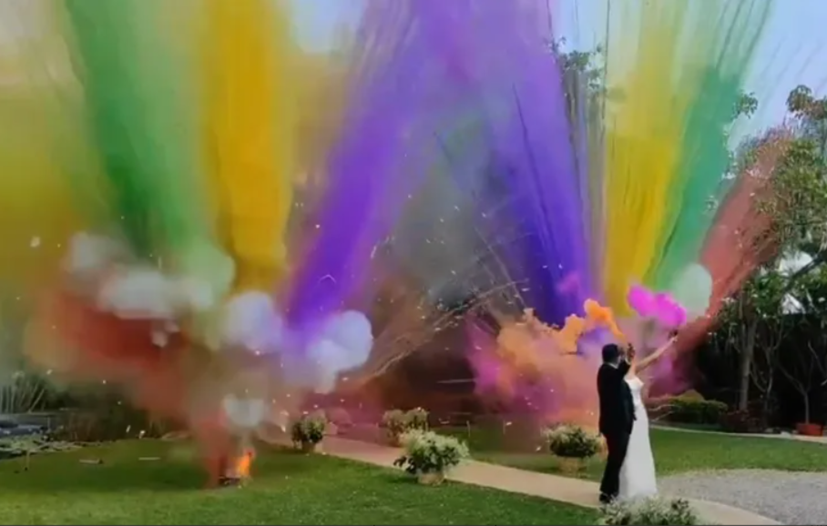 Cuenta con un sistema de disparo en abanico que libera humo y crackers de color, alcanzando una altura aproximada de 5 a 10 metros, ideal para capturar el momento en foto y video desde distintos ángulos.