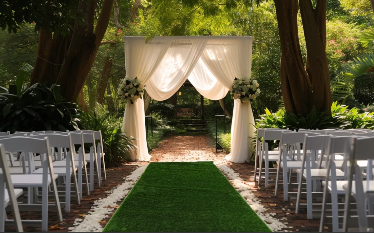 El pasillo de pasto sintético de alta calidad es una solución práctica y estética para crear recorridos verdes y ordenados en eventos, activaciones y montajes decorativos.